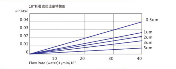 折疊濾芯的通量和孔徑、材質有關,材質越密,流量越小。一般情況下,每10英寸流量介于3~10GPM。