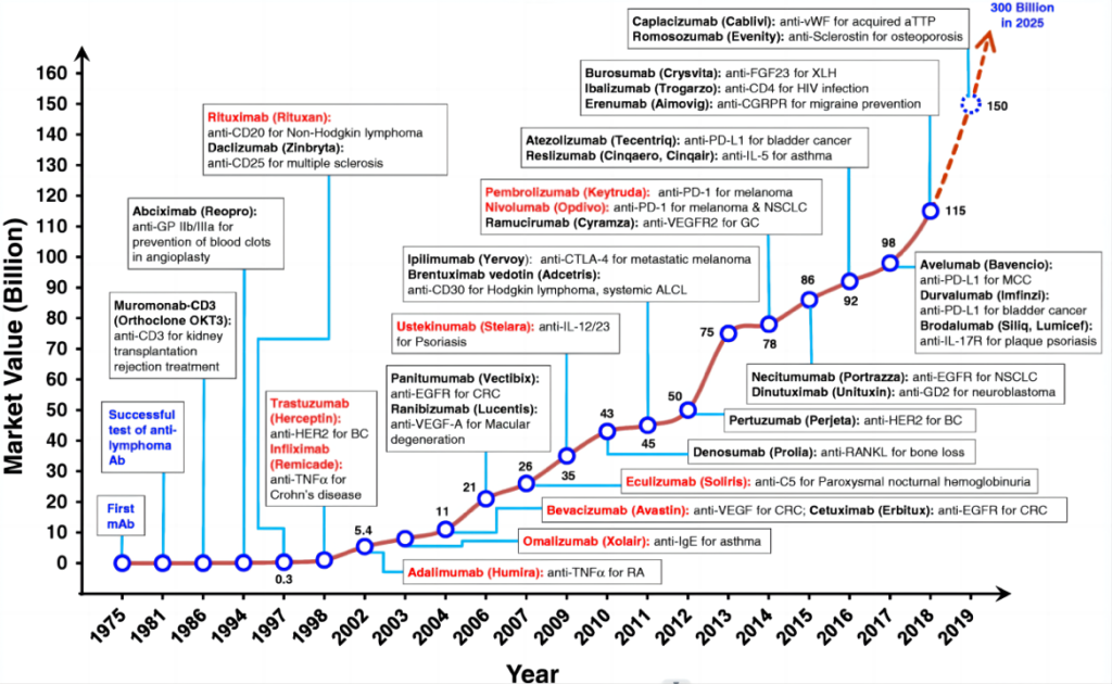 1975年,英國科學(xué)家Kohler和Milstein 首次將壽命長但不能產(chǎn)生特異性抗體的小鼠骨髓瘤細胞與壽命短但經(jīng)免疫后可產(chǎn)生特異性抗體的漿細胞(綿羊紅細胞免疫的小鼠脾細胞)在體外進行融合,創(chuàng)建了雜交瘤技術(shù),得益于該技術(shù),mAbs才實現(xiàn)了大量制備,用于基礎(chǔ)研究,并具備臨床轉(zhuǎn)化能力,開啟了單克隆抗體藥物開發(fā)的新紀元。