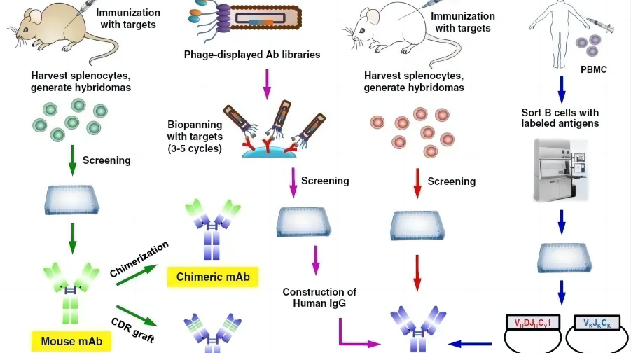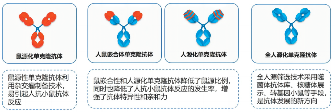 單克隆抗體的發(fā)展主要經(jīng)歷了四個階段:鼠源性單克隆抗體、人鼠嵌合性單克隆抗體、人源化單克隆抗體和全人源單克隆抗體。由于鼠源性抗體適用于人體時總會產(chǎn)生這樣那樣的不良反應(yīng),因此人源化抗體才是未來藥物的發(fā)展趨向。
