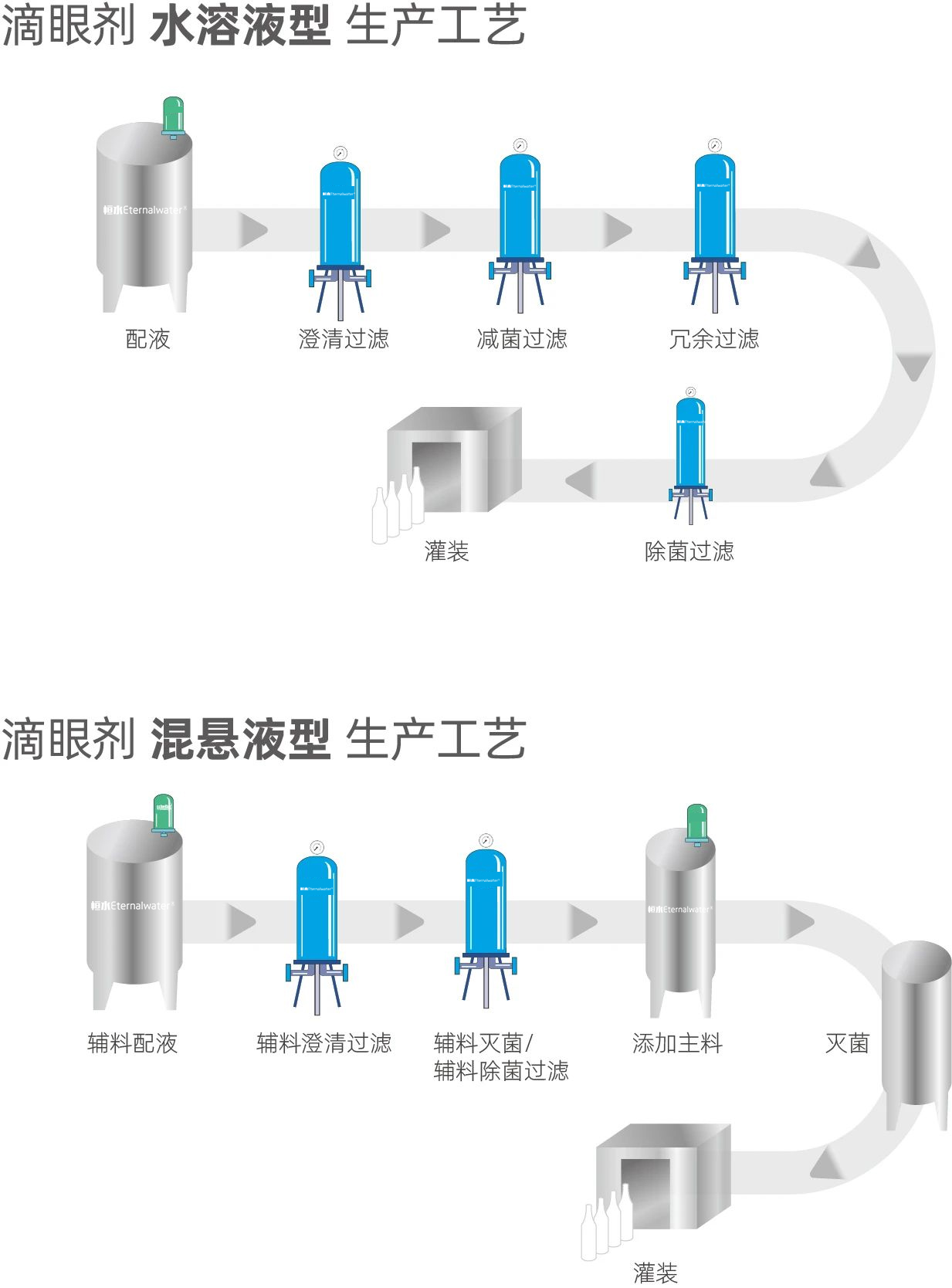 《中國(guó)藥典》2020年版通則0105眼用制劑中描述滴眼劑系指由原料藥物與適宜輔料制成的供滴入眼內(nèi)的無菌液體制劑。在滴眼劑的生產(chǎn)過程中需要將注射用水與藥物混合,然后制成滴眼劑進(jìn)行成品灌裝,分為澄明溶液、混懸液或乳狀液;也可將藥物以粉末、顆粒等形式包裝,另備溶劑,在臨用前配成澄明溶液或混懸液。