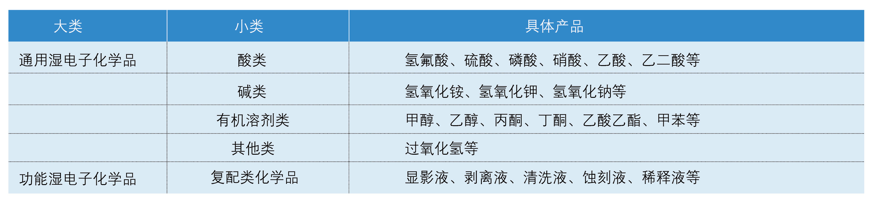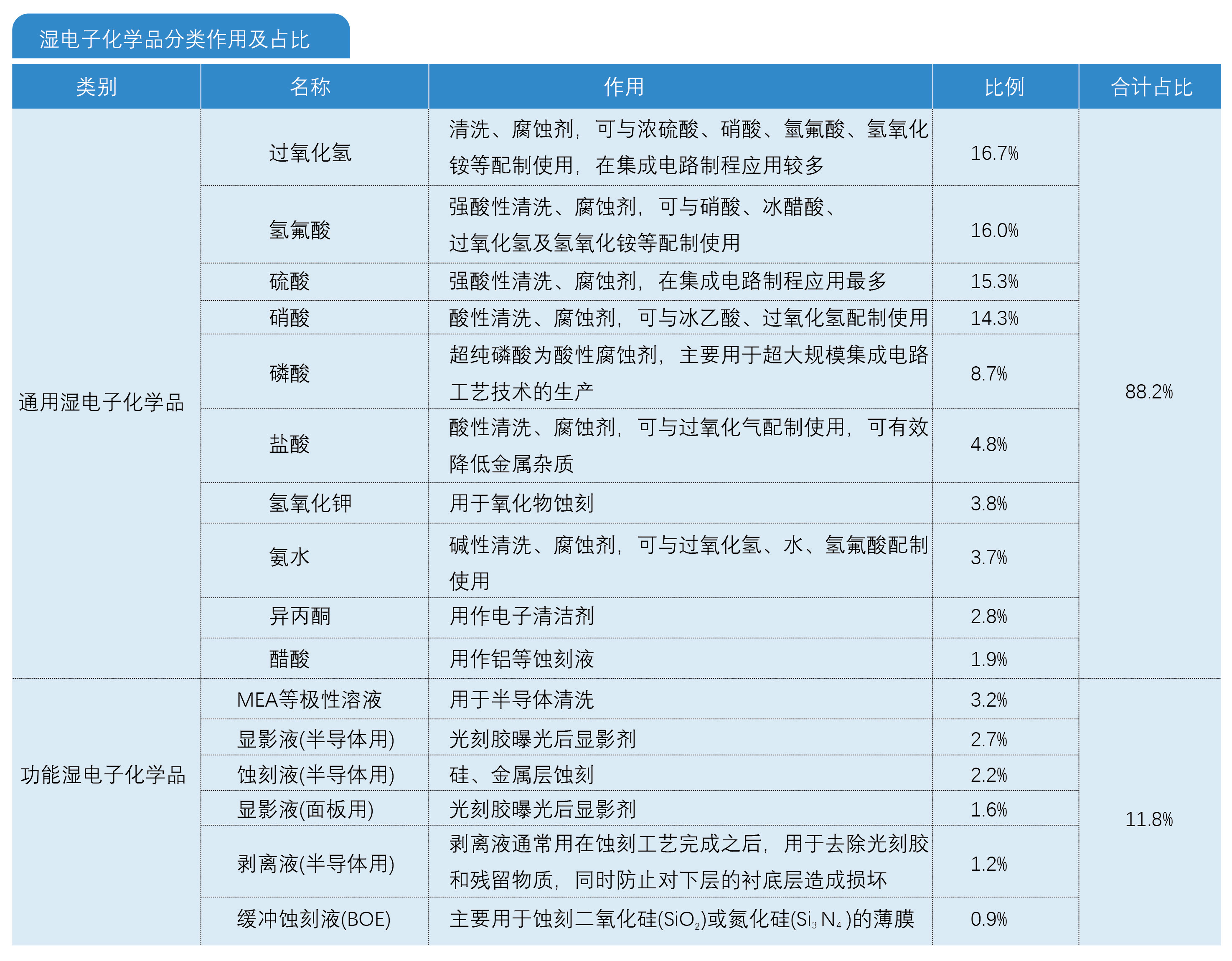根據(jù)觀研報(bào)告網(wǎng)發(fā)布的《中國(guó)濕電子化學(xué)品市場(chǎng)發(fā)展態(tài)勢(shì)分析與投資戰(zhàn)略預(yù)測(cè)報(bào)告(2023-2030)》顯示,從大類來分,一般可劃分為通用濕電子化學(xué)品和功能濕電子化學(xué)品。根據(jù)中國(guó)電子材料行業(yè)協(xié)會(huì)數(shù)據(jù),通用濕電子化學(xué)品占比88.2%,其中過氧化氫占比16.7%,氫氟酸占比16%,硫酸占比15.3%,硝酸占比14.3%。功能濕電子化學(xué)品占比11.8%,其中MEA等極性溶液占比3.2%,顯影液(半導(dǎo)體用)占比2.7%,蝕刻液(半導(dǎo)體用)占比2.2%。
