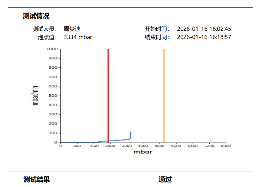 在泡點測試過程中,會有圖表的形式顯示出來,在我們的質(zhì)量保證書上會有標注,泡點的數(shù)值要達到多少以上,濾芯才會合格。